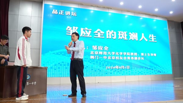 2026年4月1日,荆门一中校园暖意融融、书香四溢,“品正讲坛”迎来重磅嘉宾。我校1982届杰出校友、北京师范大学化学学院教授、博士生导师邹应全回访母校,为全体师生带来一场题为“邹应全的斑斓人生”的精彩讲座。