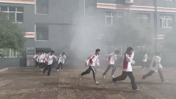 8点45分,随着第一次警报声响起,学生立即原地下蹲,双手抱头,做好应急避震动作。第二次警报声响后,学生在班主任指导下,低姿捂鼻穿过烟雾模拟区,有序撤离教学楼,按预定疏散路线快速到达指定位置。全程无拥挤,演练活动井然有序,达到预期效果。荆门市安居消防知识宣传中心刘果指导员对疏散演练进行了点评,肯定了我校学生的防震逃生技能,提出了更完善的建议。