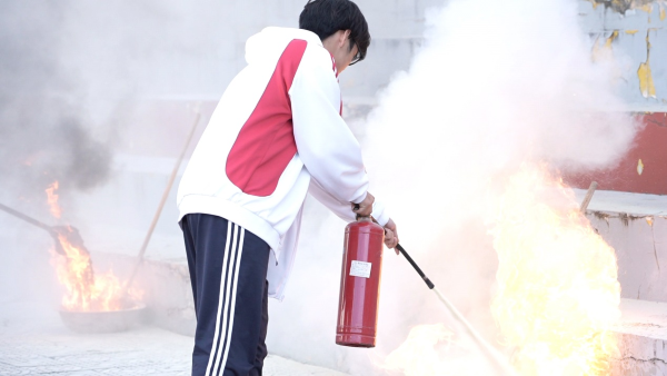 在学生灭火实操演练中,刘果指导员示范了干粉灭火器的使用方法,同学们热情高涨,积极主动的进行灭火操作,熟悉了灭火器“提、拔、握、压”的使用步骤,掌握了灭火技能。